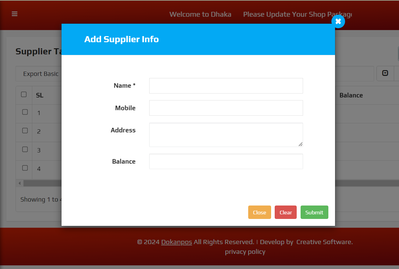 To add a new supplier, click the "Add Supplier" button, which will open a new popup window. On that form, provide the necessary information about the supplier, such as their name, mobile number,address and balance, as well as if the supplier is currently active or inactive.