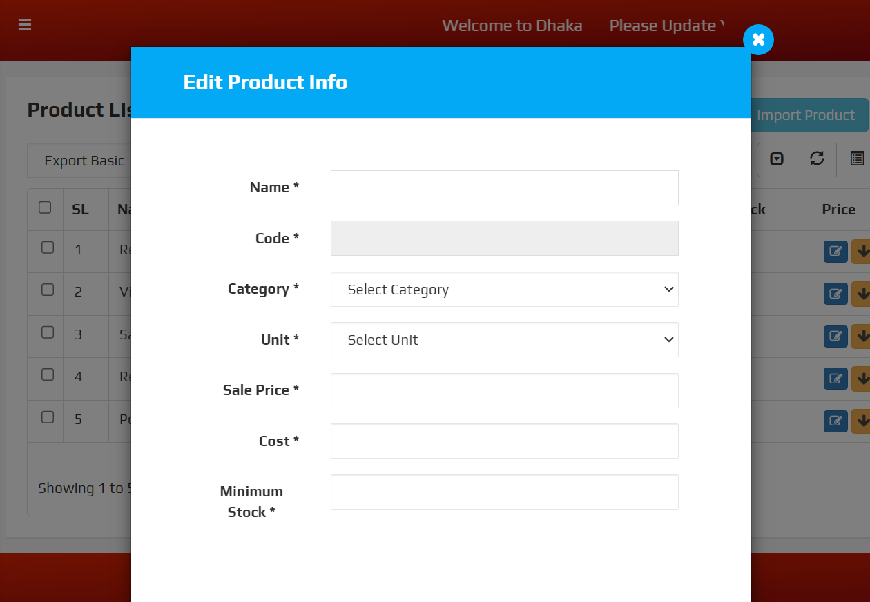 To modify a product, click the "EDIT ICON ", which will open a new popup window. On that form, enter the update details and then click the update button.